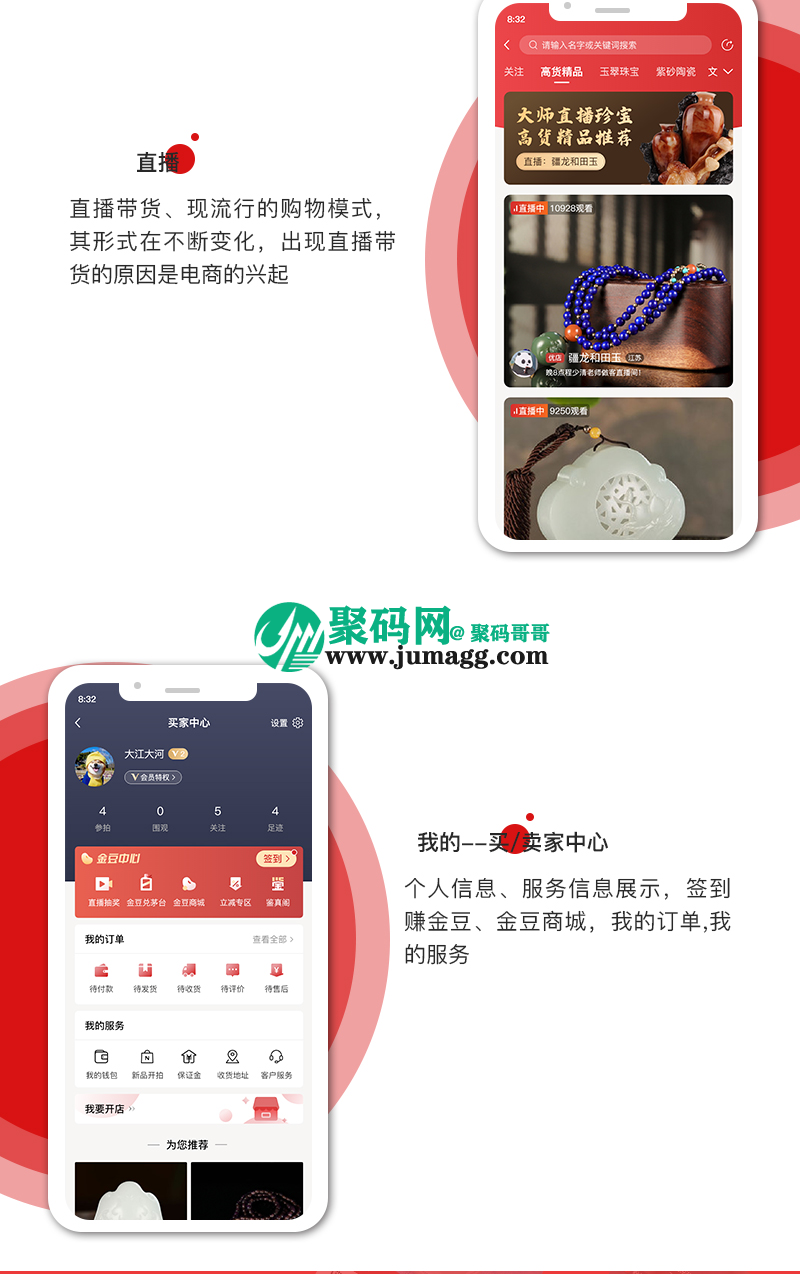 个人中心:账户明细/竞拍记录/我的晒单/收货地址/宝贝收藏/客服中心/系统设置/账户充值。